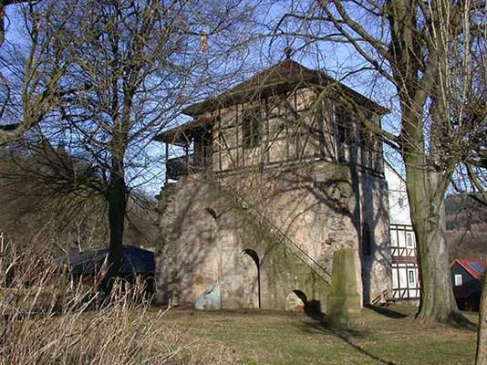 Die Ruine der alten Dorfkirche und die alte Schule.,.
